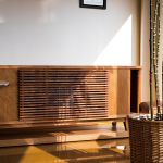 人に寄り添い、暮らしを支えていくあたたかいオーダー家具 を作り続けている「フリーハンドイマイ」。家具だけでなく、木 製スピーカーの製作も行っていることは意外に知られていな い。音響機器は機能からどうしても金属質なものになり、部屋 のインテリアにあわせにくい部分もあるが、家具をイメージし て作られたこの木製スピーカーは、部屋を選ばずしっくりとな じむ。「オーダー家具を作っているのだから、スピーカーもオー ダーで作ろうということで実現しました。注文した方にはこち らにお越しいただいて、実際の音を聞いてもらっています。こ ういう感じで音作りをしましょうというコーディネートをした り、ユニットやネットワークでこんな音が作れますという提案 を重ねて、注文者の方にヒアリングして製作しています。」