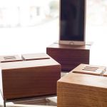 木製スピーカーは大きなものばかりでなく、iPhone用のス タンドスピーカーもある。改良を重ねた現在のスピーカーは最 新型のiPhoneにも対応し、なんと4作目。こちらも木製だが、どこを見ても接いだところがない。見え方の面白さを狙ったと いうこの形は、音の響きを重視し裏からくりぬいて製作してい るそう。